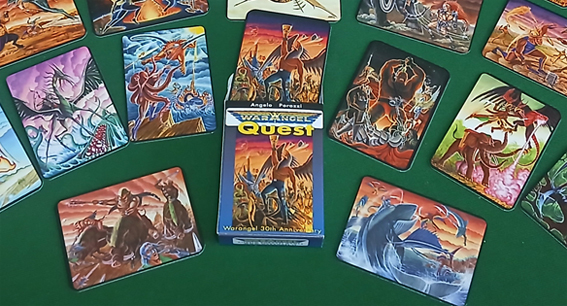 WARANGELQUEST Il Nuovo Gioco di Carte per festeggiare insieme i 30 anni di Warangel! Come vedete dalle foto, WarangelQuest è un gioco totalmente basato sulle Immagini che ho dipinto negli anni per questo universo fantasy. Ehsì: dipinto! Ognuno di questi disegni è un quadro dipinto a mano, solitamente in acrilico o tecnica mista, alcuni in formato A4 alcuni in formato A3, alcuni anche più grandi. 40 anni fa (il primo Disegno della Valchiria sul Dragone è del 1986) non esisteva l'Intelligenza Artificiale che ora vi "crea" tante immagini delle carte che vedete in giro... In questo Gioco di Carte vi ho Unito alcuni dei 120 Disegni che ho dipinto per le 120 Schede di Warangel. Mettete quante carte volete sul tavolo: più ne mettete più il gioco risulterà difficile. Per partire, consiglio una decina alla volta. Per ora, concentriamoci sulle 7 immagini che vedete nella foto qui a fianco. Chi conosce meglio Warangel sceglie un Disegno che gli piace e parte a descriverlo agli altri giocatori, assolutamente come vuole. Questo è un gioco totalmente "parlato" dove bisogna osservare e descrivere, reimparare a parlare a capirci, nella modalità che più si adatta agli altri giocatori al tavolo. Giocando con bambini potete limitarvi a descrivere cosa si vede chiaramente sulla carta "Quest'Aquila sta alzando una coppa d'oro!" Il primo bambino che copre con la sua mano quella carta la potrà prendere come punto vittoria. Ma giocando con adulti potete descrivere quella carta semplicemente dicendo: "Vittoria!" poichè l'immagine stessa comunica quel significato. Siate creativi, concettuali se volete, empatici: fatevi capire da chi avete intorno. La cosa bella è che ognuno interpreta ogni immagine a modo suo: non avrete mai descrizioni fatte allo stesso modo. Ad esempio, una signora, a una fiera, disse così: "me lo faccio con le patate"... e mettendomi nella sua testa ho preso la carta con il Tentacolato poichè la Signora pensava proprio al Polpo: il Polpo con le patate!:) Tanta osservazione, tanta empatia con chi avete vicino: se giocate con giocatori di Warangel potete andare su domande molto tecniche o tematiche "questa razza usa la trasformazione" o usare "Keywords", parole chiave, dicendo ad esempio semplicemente "India!". Chi riconosce Ganesh, l'Elefante con le tre proboscidi simbolo della saggezza, sulla carta dove si vede anche Kali, prende quella carta come punto... Chi indovina, fa la domanda successiva per gli altri giocatori. Man mano che le carte vengono indovinate, aggiungetene delle nuove: giocando con Bambini consiglio poche alla volta, massimo 10; giocando con adulti aumentate a circa 20 carte alla volta. Quando tutte le carte son state indovinate, chi ne ha prese di più è il vincitore:) Per le vostre Fiere ed Eventi Ludici, Scuole,