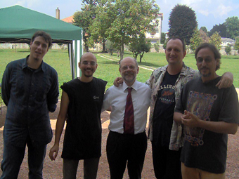 Ecco i due organizzatori che mi hanno personalmente invitato a questa prima edizione: Mario Sacchi e Paolo Lombardi, entrambi conosciuti all’Area Autoproduzione a La Città del Gioco, la storica Ludoteca di Milano. Al centro l’amico Giorgio Viappiani, che mi ha accompagnato all’andata, Angelo e Marco.